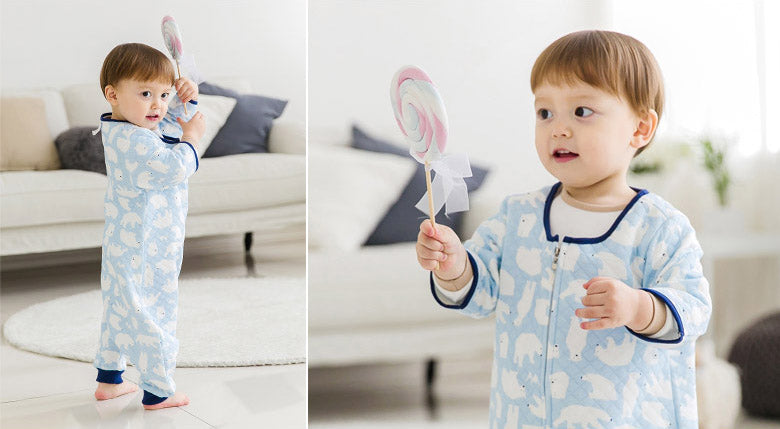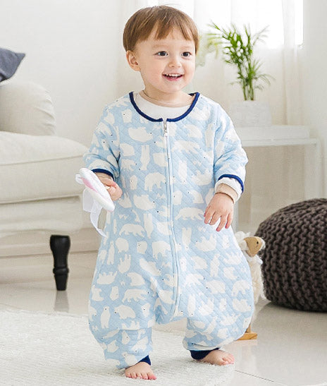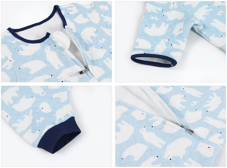 The three-quarter–length sleeves allow for easy movement, and the long front zipper makes dressing and undressing quick and convenient. For babies who tend to kick off their blankets while sleeping, wearing this sleep sack helps keep their tummy covered so they can stay warm and sleep comfortably. With its charming polar bear design, it’s sure to be a favourite among little polar bear lovers.
